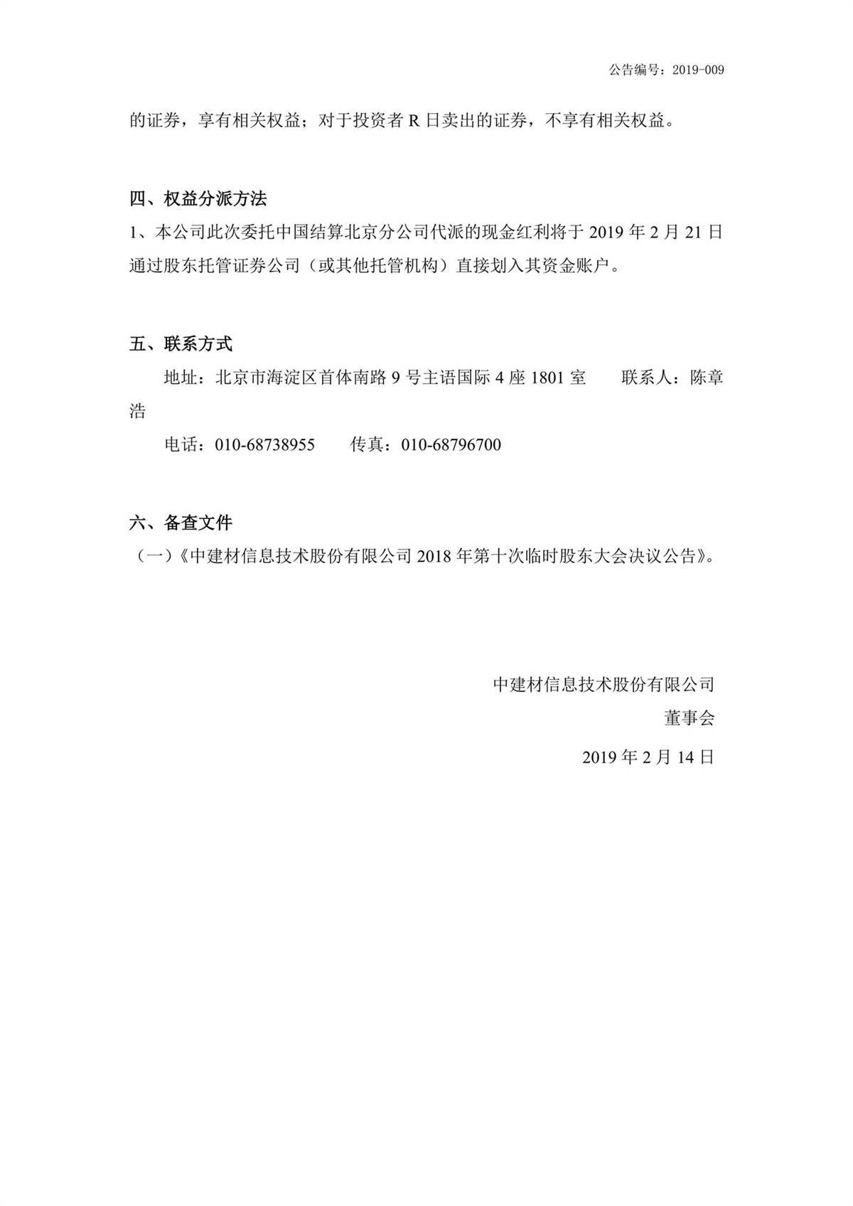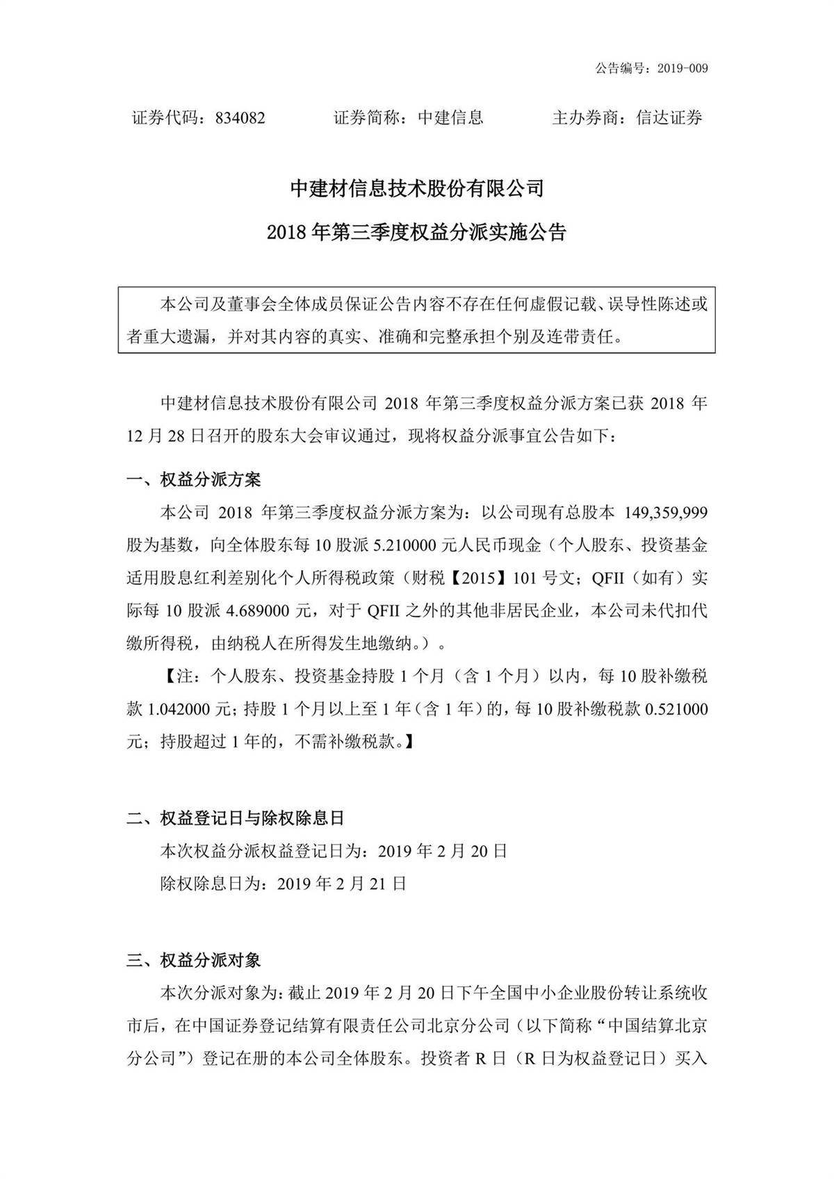 中建信息2018年第三季度權益分派實施公告